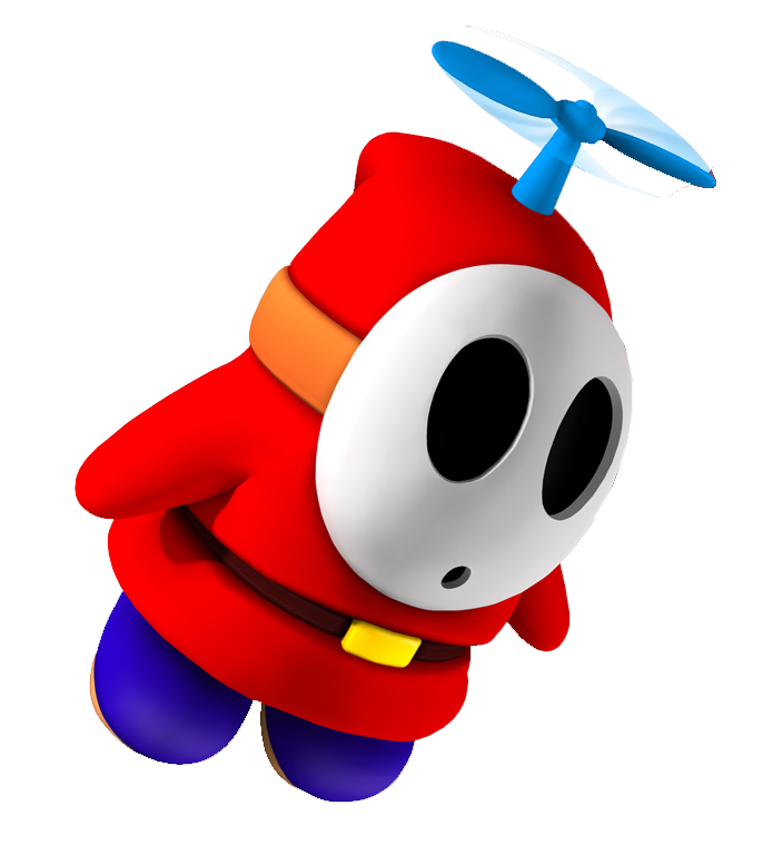 Fly Guys are Shy Guys with propellers. They mainly appear in the Yoshi series but have appeared in a few Mario games as well. In the Yoshi series, they hold items when flying.